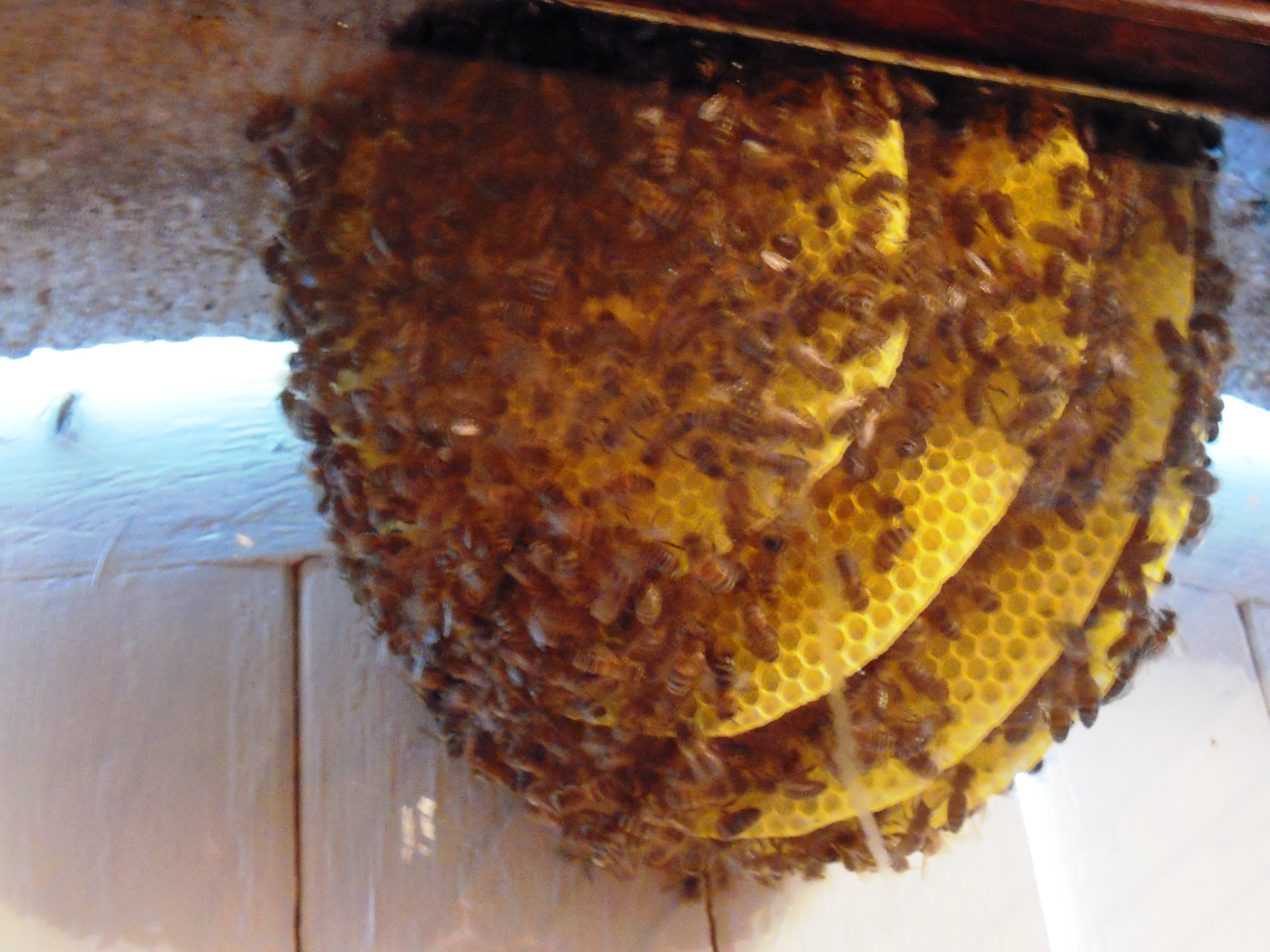 Our local farmer and friend has advised us that the Queen in this hive having being displaced by the Queen in the other hive between our thick stonewall decided to migrate to this spot and some of the faithful decided to follow her. He quite correctly noted that the Bees in the region are endangered as a result of the use of pesticide and that we should try to protect these. One of his older friends, who is a bee keeper, will be coming to “recuperate” our surprise of a hive. I must say that we are caught between wanting to leave the bees alone, having seen the work they have done thus far, and being protective of this sweet place we call home. We are caught between a glass window/view and a bee hive!