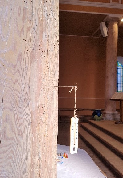 The thermometer hanging blissfully suspended from the side of one of the tall wooden pillars allow some play for the imagination. The church is in the mountains, where it can get very cold. I thought, though, of that open-bible obliquely beyond the temperature gauge which will offer some perennial heat and heated conversations (as may have happened over the years in the story of the French Protestants). Besides the pulpit is not far away from this suspended gauge – a timely reminder as to whether the message will be hot or cold. This Sunday it was spot on!